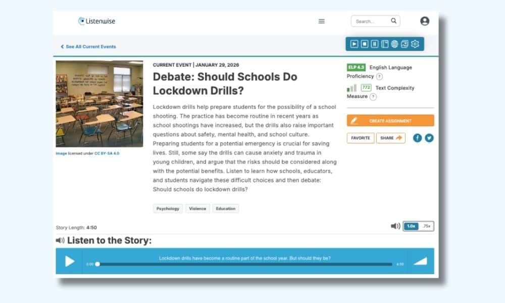 I chose the debate-style podcast, Should Schools Do Lockdown Drills? Since we already practice writing and supporting claims in class, this was right up our alley. I modeled the platform first, showing the students the different functions and what to do after they finished listening.